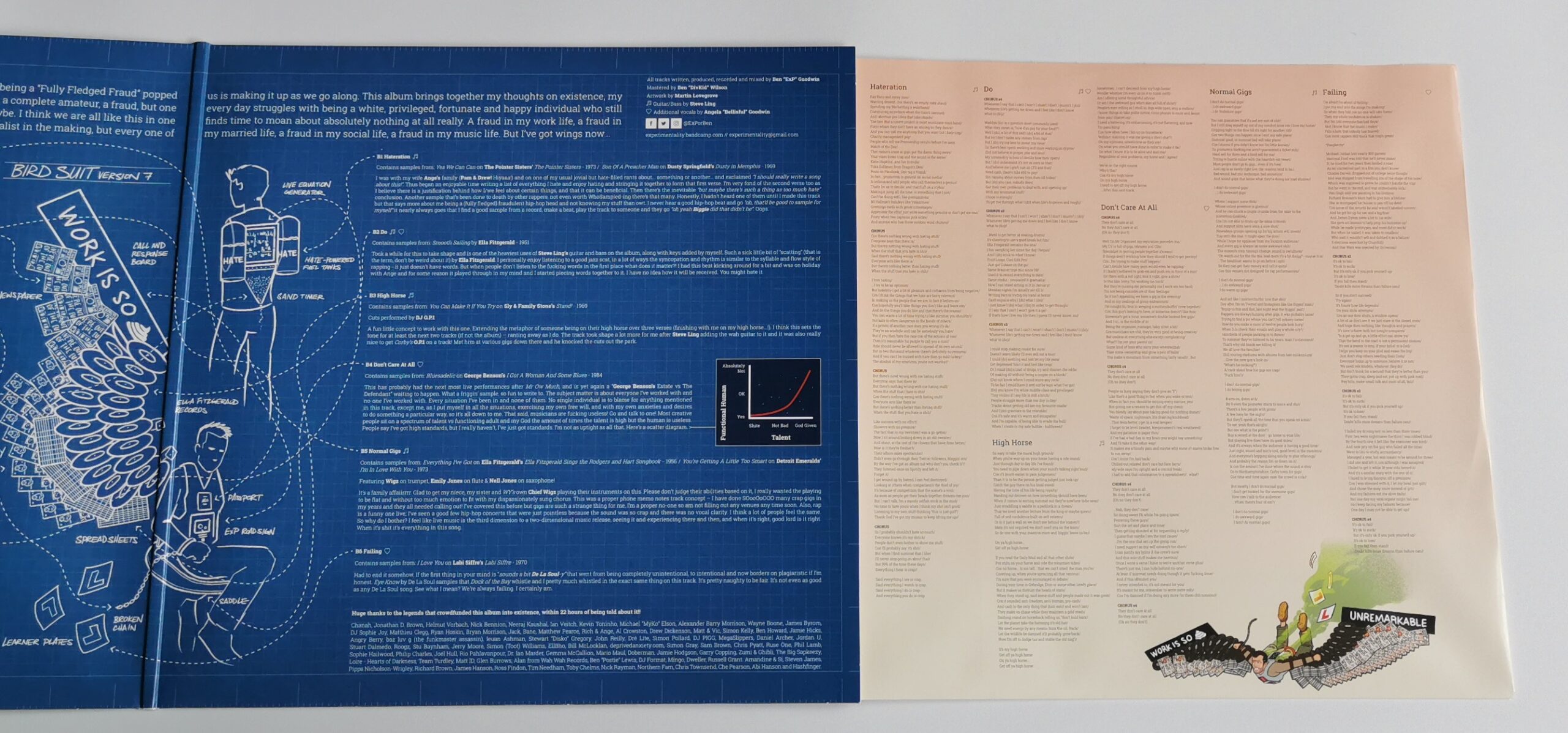 I was trying to think of a way to describe myself, especially in terms of hip-hop, and the concept of being a “Fully Fledged Fraud” popped into my head. This is exactly what I am. In music, or otherwise, everything I attempt to do is done as a complete amateur, a fraud, but one who’s been “having a go at it” for so long that maybe it isn’t completely obvious to the onlooker. Maybe. I think we are all like this in one way or another, every specialist is just a beginner who put a lot of time in, every beginner is a specialist in the making, but every one of us is making it up as we go along. This album brings together my thoughts on existence, my every day struggles with being a white, privileged, fortunate and happy individual who still finds time to moan about absolutely nothing at all really. A fraud in my work life, a fraud in my married life, a fraud in my social life, a fraud in my music life. But I’ve got wings now…